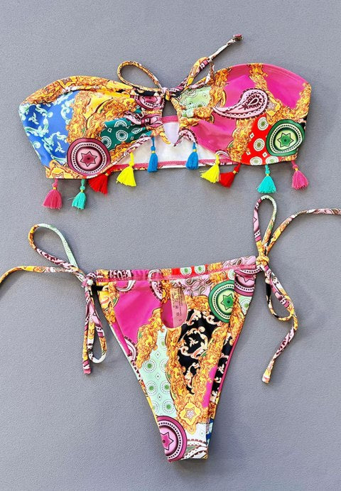 Women's 3packs Allover Print Bikini Set and Drawstring Side Cover Up Skirt