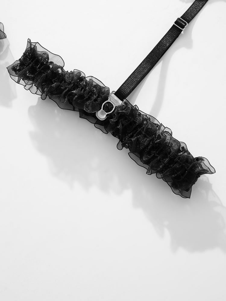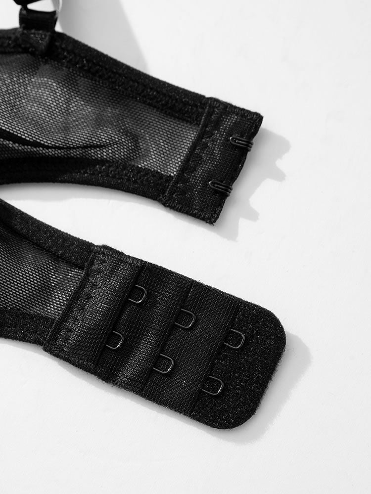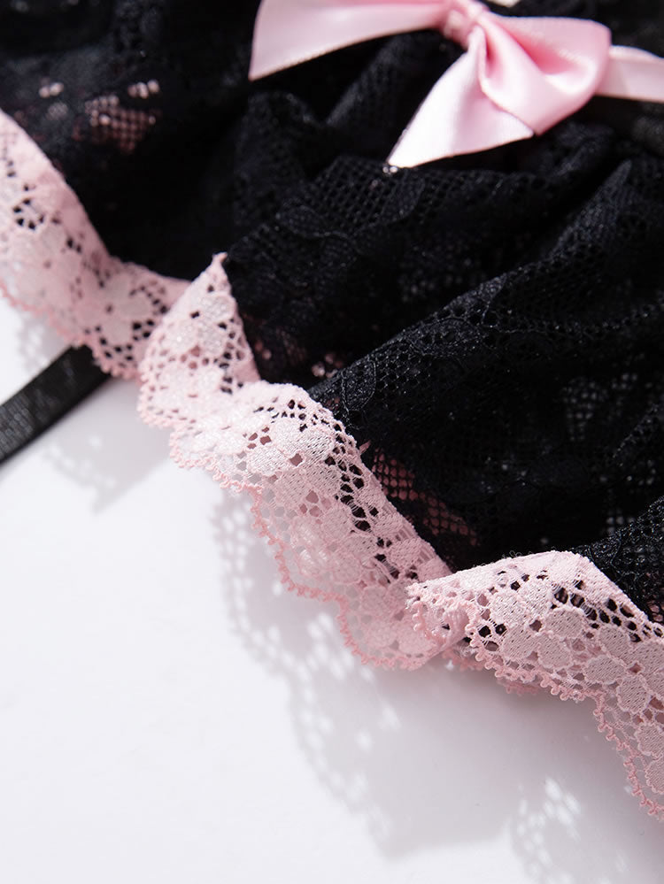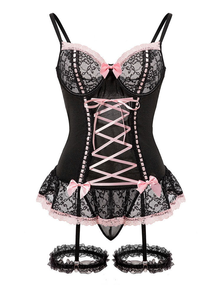 Make your special night unforgettable with this enticing bustier set. It features sheer lace underwire cups adorned with satin bow accents and adjustable spaghetti straps for a perfect fit. A hook-and-eye back closure with a keyhole adds a touch of allure. The solid bodice showcases a playful lace-up detail and a flirty lace hem. Complete the look with adjustable garter straps, wraparound leg garters, and a matching G-string for an evening of irresistible charm.